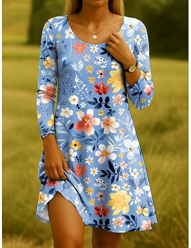 Kvinnors mini klänning crew neck lång ärm casual klänning T-shirt klänning tee klänning A-linje klänning casual regular fit blommig grafisk scoop neck svart blå lila grön vår höst vinter
