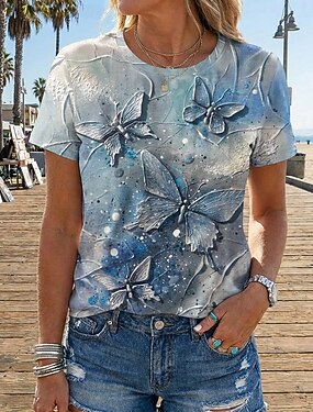 Dam T-shirt Mönster Fjäril Mode Modern Kortärmad Rund hals Vanliga toppar Dagligen Blå Gul Rodnande Rosa Himmelsblå Sommar