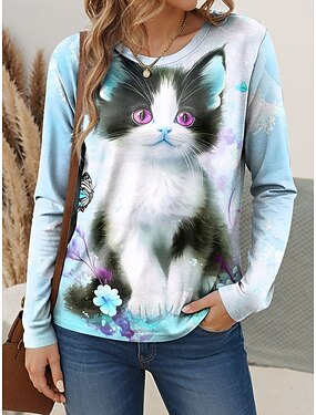 Dam T-shirt Crew Neck Långärmad Tunika Blommig Grafisk Katt Vintage Stilig Klassisk Vanliga Toppar Daglig Weekend Tryck Rosa Blå Lila Grön Vår Höst