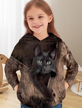 Flickor 3D Katt Huvtröja Pullover Långärmad 3D-tryck Vår Höst Aktiv Mode söt stil Barn 3-12 år 4-12 år Huva Utomhus Ledigt Dagligen Normal