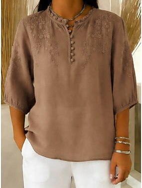 Dam Skjorta Linneskjortor i bomull Blus Konstbomullslinne Broderad Knappar Slät Stylish Klassisk Modern Långärmad Rund hals Vanliga toppar Dagligen Helgdag Utekväll Blå Svart Vit Rodnande Rosa Brun