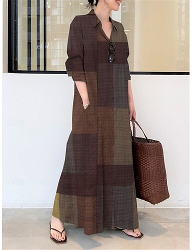 Dam Maxiklänning Skjortklänning Vardagsklänning Swingklänning Ledigt Dagligen Normal Rutig Långärmad Tröjkrage Rubinrött Marinblå Brun Vår Höst