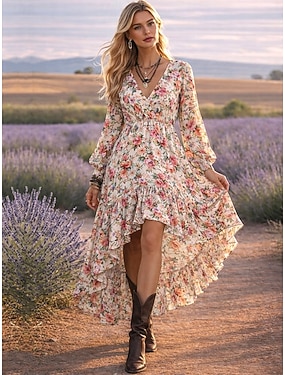 Dam Maxiklänning Plisserad klänning Fit And Flare Klänning Födelsedag Ledigt Formell Strand Datum Normal Blommig Grafisk Långärmad V-hals Rodnande Rosa Sommar Vår