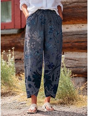 Dam Bomulds Blanding Kinesiska Byxor Sommarbyxor Semester Grundläggande Ledig / Sportig Ankellång Medium Midja Grafiska tryck Maskros Ficka Opressade byxor Mönster Komfort Bekväm Oelastisk Dagligen