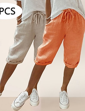 flerpack 2 st dam linnebyxor capribyxor sommarshorts semester mode casual dagligen knälång naturlig enfärgad dragsko ficka resår i midjan andningsbar bekväm oelastisk