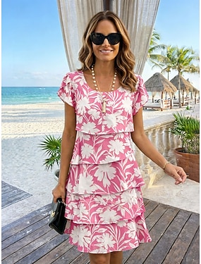 Dam Knälång klänning A linjeklänning Semester Ledigt Boho Strand Normal Blommig Grafisk Kortärmad V-hals Rodnande Rosa Sommar Vår