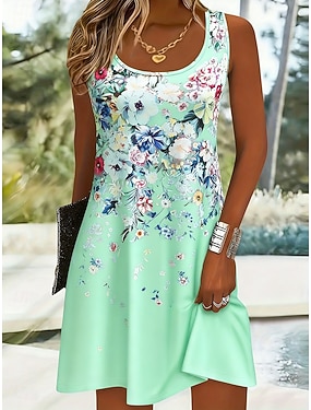 Dam Midiklänning Skiftklänning Solklänning A linjeklänning Semester Ledigt Boho Strand Fest Normal Blommig Grafisk Ärmlös Rund hals Gul Rodnande Rosa Grön Sommar Vår
