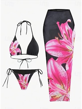 Kvinnors bikini 2-delad baddräkt med bygel tuff slank rygglös semester strandkläder blommig grafisk halterneck ärmlös baddräkt