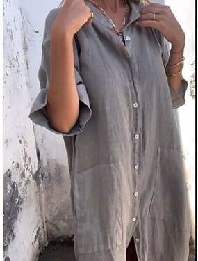 Dam Långklänning Maxiklänning 100% Linne Skjortklänning Klänningar i bomullslinne Linne Klänning Grundläggande Ledigt Ledigt Dagligen Semester Lös passning Slät Halvlång ärm Tröjkrage Blå Grön Kaki