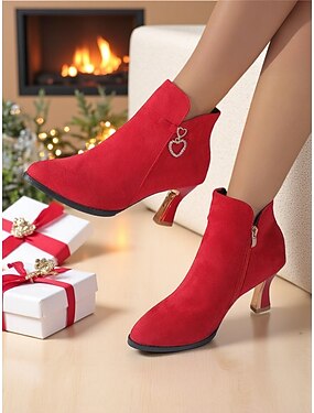 Damstövlar i mocka med hjärtliknande strass och guldfärgade klackar, eleganta korta stövlar med spetsiga tår för julfester och vinterkläder. &dejtkvällar