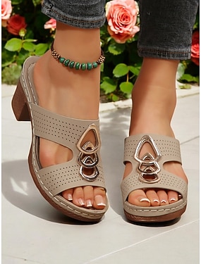beige, tjocka klacksandaler för kvinnor med utskurna remmar – bekväma avslappnade rutschkanor med klackar för casual sommaroutfits