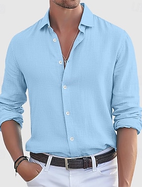 Herr Skjorta Linneskjorta Sommarskjorta Strandskjorta Ensfärgat Ledigt Semester Blå Svart Vit Rodnande Rosa Långärmad Tröjkrage Sommar Vår Kläder Ficka