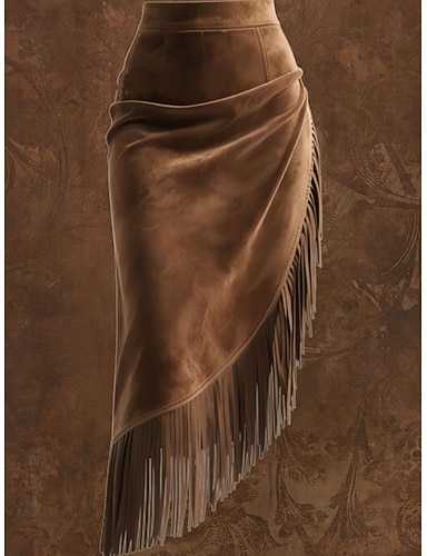 Dam Vintage Mode Ledigt Asymmetrisk Mellanhög midja Kjolar Slät Rynkad Tofs Oelastisk Dagligen Semester Brun Sommar Polyester