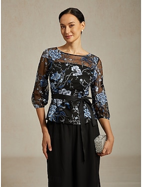 Dam Dressiga toppar Broderad Illusionspets Elegant 3/4 ärm Rund hals Kvällsfest Bröllopsgäst Semiformell Svart Vår Höst Vinter