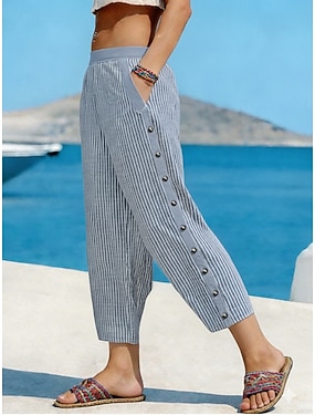 Dam Konstbomullslinne Byxor Sommarbyxor Klassisk Ledigt Fullängd Naturlig Randig Ficka Mateial som andas Mjuk Bekväm Microelastisk Gata Dagliga kläder Ljus himmelblå Grå Ljusgrön Sommar Normal