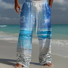 Herr Hav Landskap Långbyxor Säckiga byxor Casual byxor Medium Midja Hawaiisk Utomhus Semester Standkläder Elastisk dragsko i midjan Linneliknande byxor med fickor Sommar Vår 3D-tryck Blå Blå 1 Ljusblå
