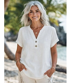 Dam Blus Knappar Ensfärgat Stylish Ledigt Kortärmad V-hals Vanliga toppar Dagligen Blå Svart Vit Rubinrött Aprikos Sommar Vår