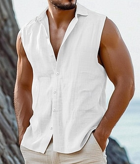 Herr Skjorta linneskjorta Sommarskjorta Standkläder Knapp upp skjorta Slät Semester Curise Vit Rodnande Rosa Ljusblå Ärmlös Krage Sommar Vår Kläder