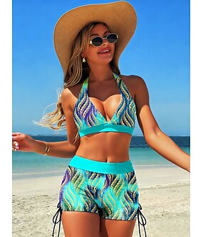 Damens Bikinis 2-delat Badkläder Hög midja Rygglös Semester Strandkläder Grafisk Tropisk V-ringad Ärmlös Baddräkter