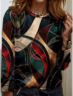 Dam T-shirt Mönster Grafisk Geometrisk Färgblock Vintage Stylish Klassisk Långärmad Rund hals Vanliga toppar Dagligen Blå Vår Höst Vinter