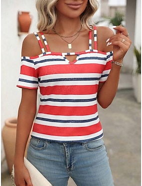Dam T-shirt T-tröja Lappverk Mönster Randig Mode Stylish Ledigt Kortärmad Över axeln Vanliga toppar Dagligen Utekväll Helgen Blå Rubinrött Sommar Vår