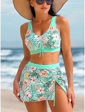 Damernas tankini 2-delad baddräkt rynkad med kjol kjol 3D blommig semester strandkläder grafisk rund hals ärmlös baddräkt
