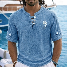 Herr Pikétröjor Tvätta skjorta i 100 % bomull Ledigt Helgdag Kraglös Kortärmad Mode Grundläggande Palmträd Knappar Årgång Sommar Vår Blå Rubinrött Purpur Grön Grå Pikétröjor