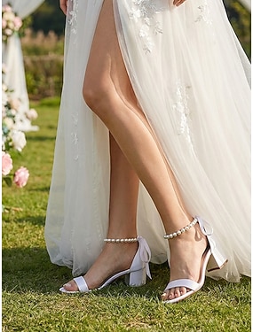 Vita brudsandaler med blockklack för kvinnor – pärlhalsband med öppen tå och vristrem för trädgårdsbrud