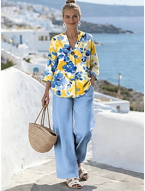 Dam Tvådelade set Byxuppsättningar 3/4 ärm V-hals Blommig Grafisk Mönster Dagligen Stylish Ledigt Dagligen Semester Blå Rodnande Rosa Grön Sommar Normal