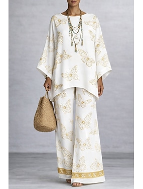 Dam Byxuppsättningar Halvlång ärm Fjäril Rund hals Blommig Grafisk Elegant Semester Ledigt Dagligen Slå samman Beige Vår & sommar Normal