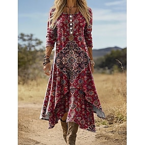 Kvinnors Midi Klänning Boho Shift Klänning Semester Fest Avslappnad Daglig Helg Regular Passform Grafik Geometrisk Paisley Långärmad Crew Neck Svart Rosa Röd Orange Sommar Vår Höst