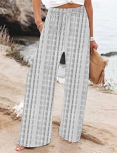 Dam Brett skaft Byxor Palazzo byxor Mode Boho Fullängd Hög midja Rutig Snörning Elastisk midja Mönster Mateial som andas Bekväm Gata Dagliga kläder Utekväll Vit Vår Höst Normal
