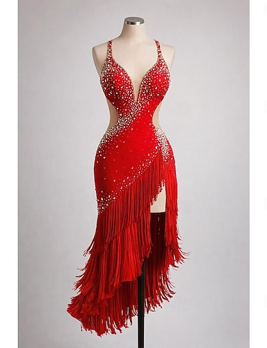 Damklänning med röda strassfransar och ärmlös v-ringad latinamerikansk dansklänning för ballroomtävling