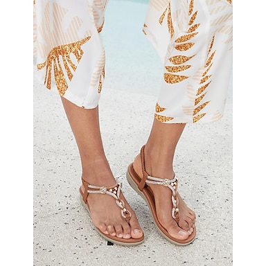 damsandaler med boho t-band med pärlor – lediga platta sommarskor med elastiskt ankelband, perfekt för strand- och vardagsbruk