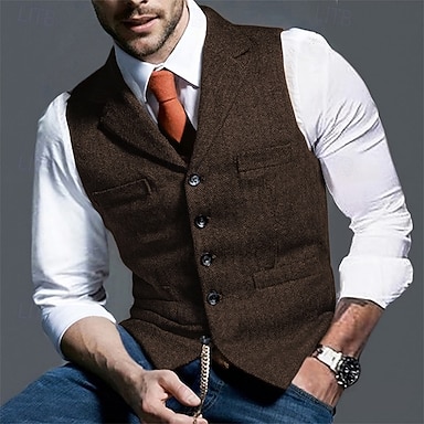 Herr Tweedväst Väst Formell Bröllop Semester Företag Punk Vintage Vår Höst Ficka Knappar Polyester Bekväm Fiskben Enkelknäppt V-hals Smal passform Svart Vin Marinblå Brun Väst