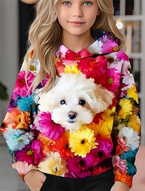 Flickor 3D Blommig Hund Huvtröja Långärmad Höst Vinter Mode Förtjusande Grundläggande Barn 4-12 år Huva Utomhus Ledigt Dagligen Normal