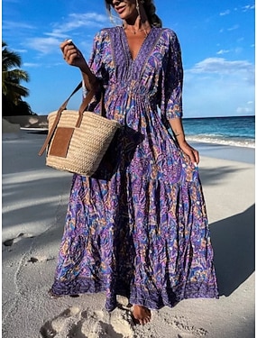 Dam Maxiklänning Boho-klänning Vardagsklänning A linjeklänning Klänning med tryck Vintage Utomhus Strand Semester Normal Blommig Grafisk Kortärmad V-hals Purpur Sommar Vår