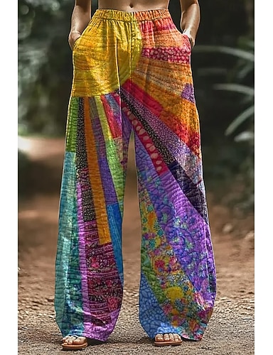 Dam Brett skaft Byxor Semester Vintage Etnisk Stil Fullängd Medium Midja Blommig Snörning Ficka Elastisk midja Bekväm Mateial som andas Microelastisk Semester Gata Vardag Gul Rodnande Rosa Blå Purpur