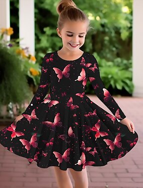 Flickor 3D Grafisk Fjäril Klänning Långärmad 3D-tryck Sommar Höst Sport & Utomhus Dagligen Helgdag söt stil Ledigt Skön Barn 3-12 år Vardagsklänning A linjeklänning Ovanför knäet Polyester Normal