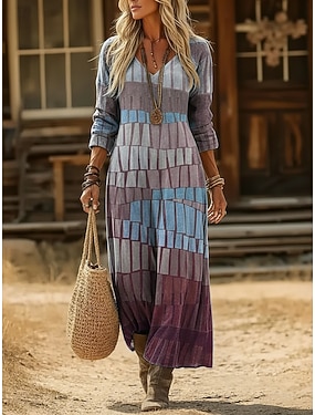Dam Maxiklänning Boho-klänning Vintage klänning Vardagsklänning Vintage Dagligen Utomhus Semester Lös passning Geometrisk Långärmad V-hals Blå Purpur Fuchsia Grön Vår Höst