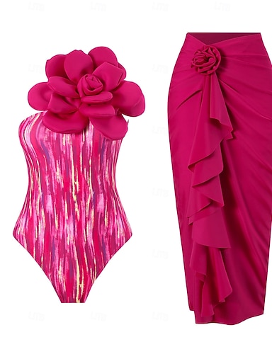 Dam Badkläder En bit 2 st Monokini Kjol Baddräkt Magkontroll Hög midja Smal Öppen rygg Semester Standkläder Blommig Asymmetrisk hals Ärmlös Baddräkter