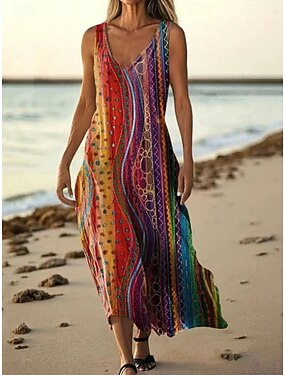 Dam Långklänning Maxiklänning Vardagsklänning Linneklänning Sommarklänning afrikansk Dagligen Strand Helgdag Normal Blommig Rutig Ärmlös V-hals Blå Marinblå Fuchsia Sommar