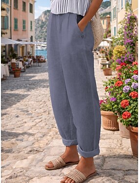 Dam Cotton Långbyxor Sommarbyxor Strandbyxor Semester Mode Ledigt vardag Ankellång Hög midja Slät Elastisk midja Sidoknapp Lättvikt Bekväm Andningsfunktion Oelastisk Streetwear Strand Helgdag Bl