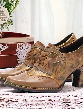 Dam Klackar Pumps Handgjorda skor Vintage skor Bröllop Fest Blommig Liten klack Rundtå Elegant Vintage Premium läder Snörning Brun