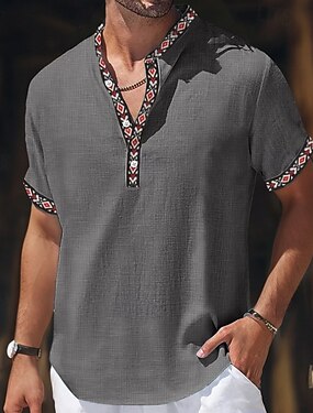 Herr Skjorta Linneskjorta Sommarskjorta Standkläder Geometrisk Semester Ledigt Rubinrött Grön Kaki Grå Kortärmad V-hals Sommar Vår & sommar Kläder Färgblock