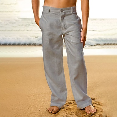 Herr Linne Byxor Långbyxor Sommarbyxor Strandbyxor Framficka Rakt ben Slät Komfort Andningsfunktion Ledigt Dagligen Helgdag Mode Grundläggande Svart Vit