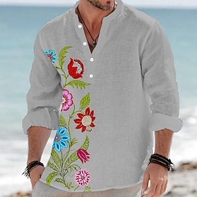Herr Blomtryck Etnisk Blommor Skjorta Ståkrageskjorta Långärmad Vintage retro Semester Dagliga kläder Utekväll Vår Höst Kraghalsband Bandkrage Button-Down Linne som skjorta Grå