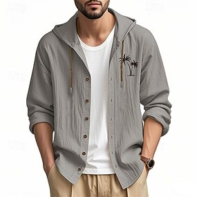 Herr Skjorta Linneskjorta Casual skjorta Knapp upp skjorta Bomullskjorta Kokosnötsträd Semester Hawaiisk Svart Vit Himmelsblå Kaki Långärmad Huva Vår Höst Kläder Mönster