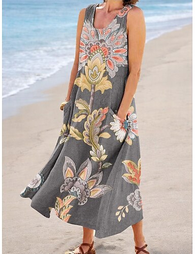 Dam Midiklänning Solklänning A linjeklänning Semester Ledigt Boho Helgdag Lös passning Blommig Grafisk Ärmlös U-hals Salvia grön Grön Grå Sommar Vår