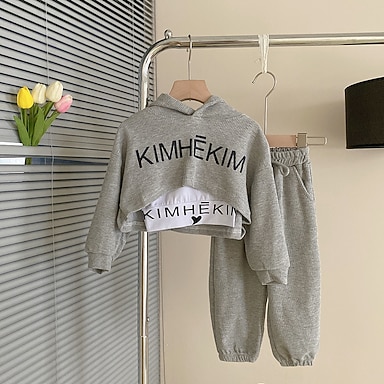 3 delar Barn Flickor Bokstav Broderad Huvtröja & träningsbyxor Set Uppsättning Långärmad Mode Utomhus Bomull 3-7 år Vår Rodnande Rosa Grå